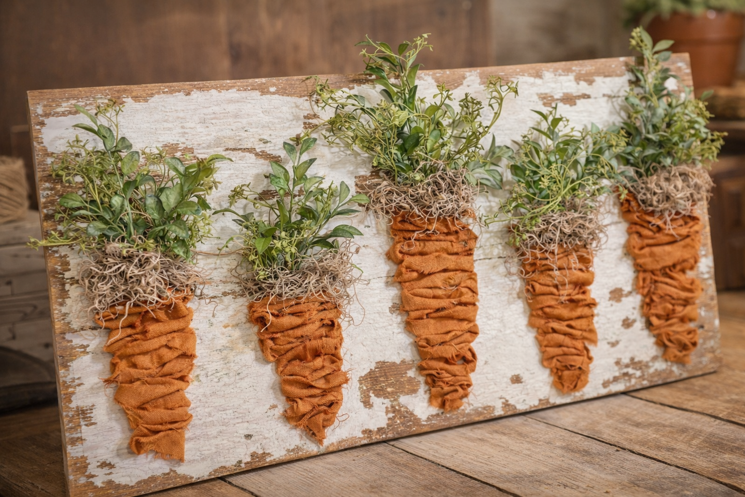 In this hands-on mixed media workshop, you’ll create a rustic carrot board using reclaimed-style wood, layered fabric, and soft greenery to build a dimensional seasonal piece that feels warm and farmhouse-inspired — not fussy.